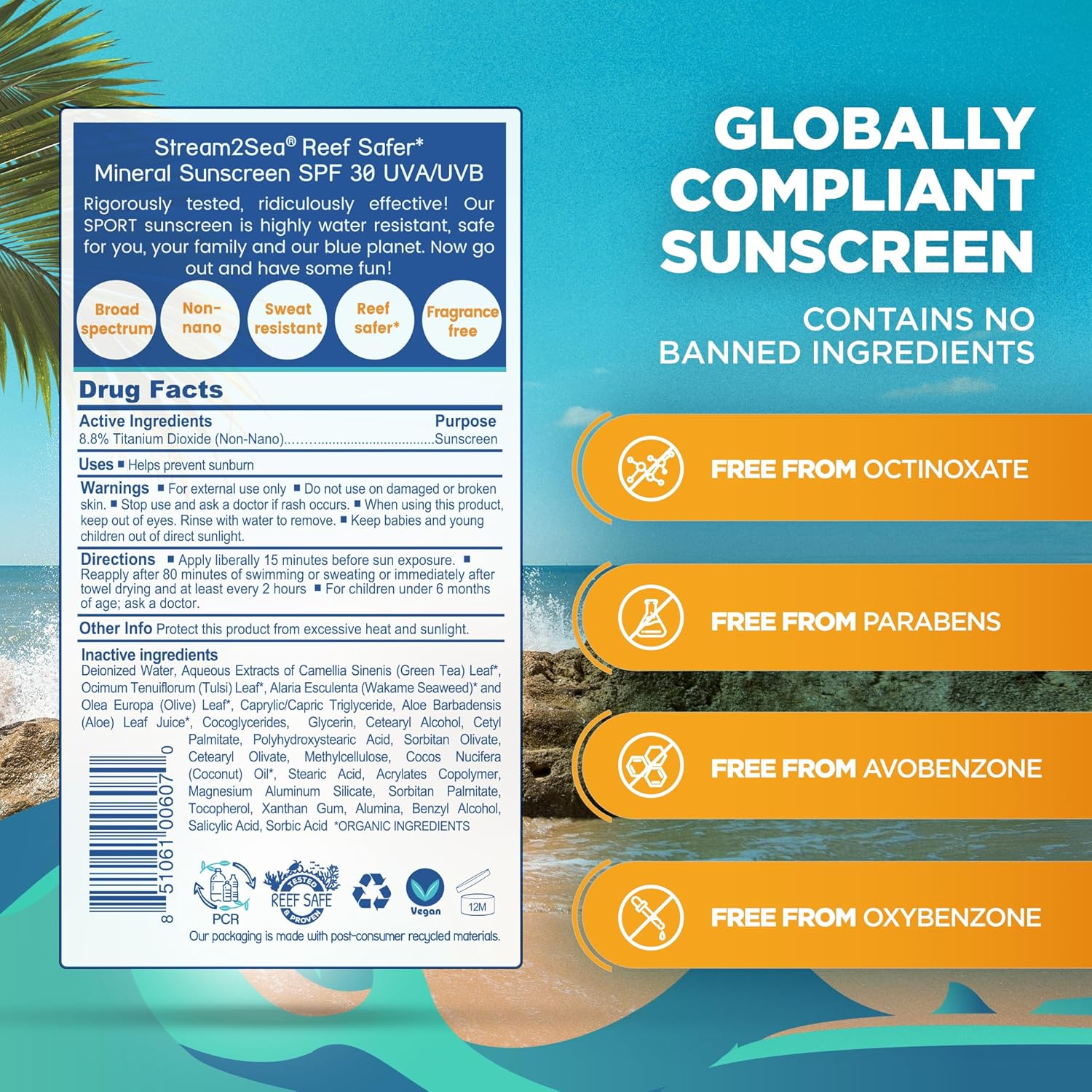 - FAST ABSORBING formula is non greasy, paraben free, gluten free, oxybenzone free, ecoconscious, octinoxate free and non-nano. This ocean safe sunscreen has been tested and proven safe for humans, freshwater and saltwater marine life.