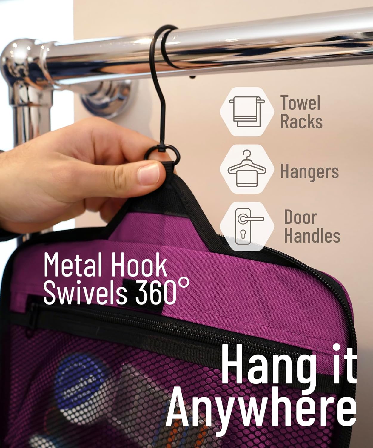 - Convenient Hanging Hook: The XXL metal swivel hook allows you to hang the bag anywhere, saving valuable counter space. It's perfect for use in hotels, bathrooms, or even on a camping trip.