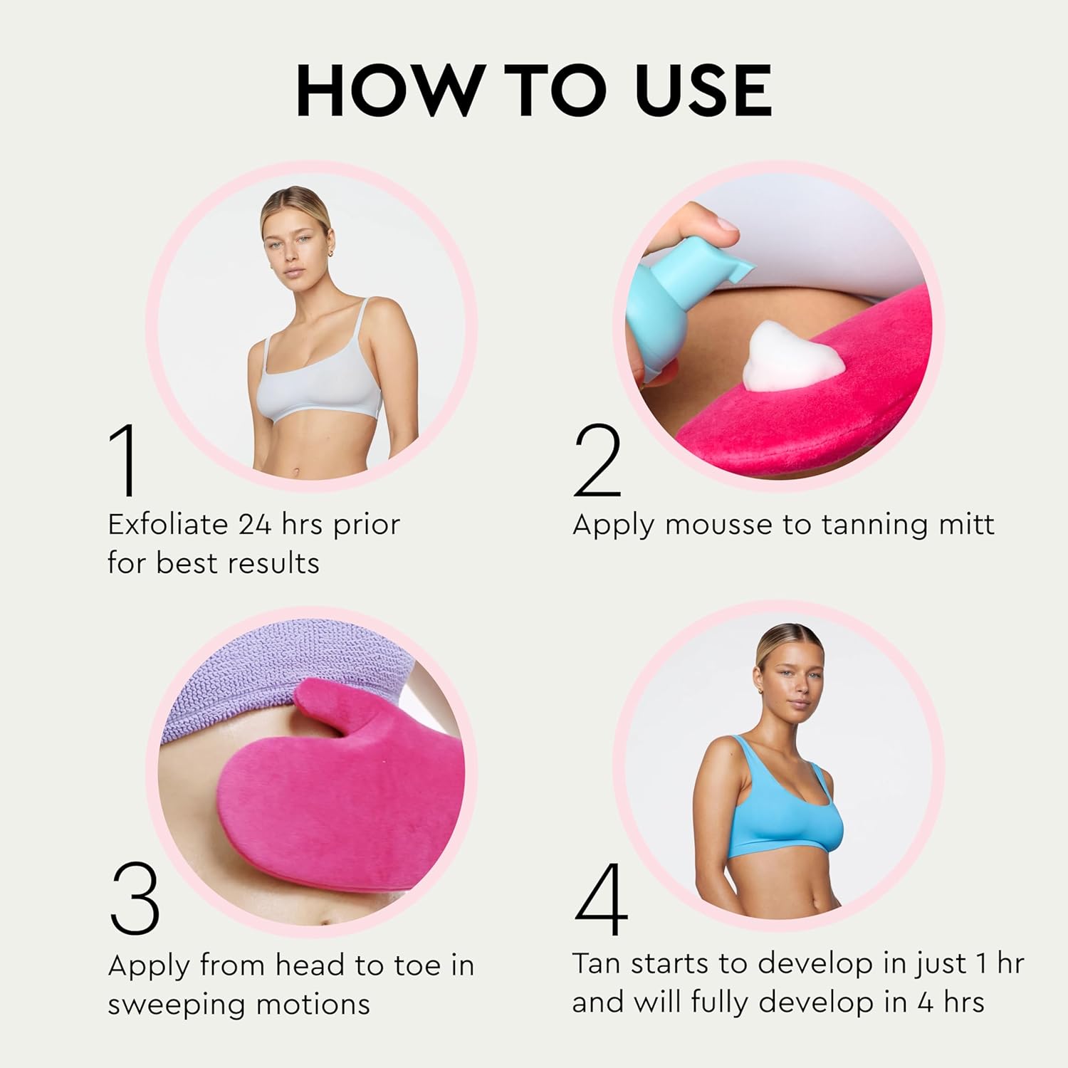 - Self-tanning mousse develops in 1-3 hours and dries quickly without an orange tone. Apply with a tanning mitt and leave on longer for a deeper, customizable bronzy glow