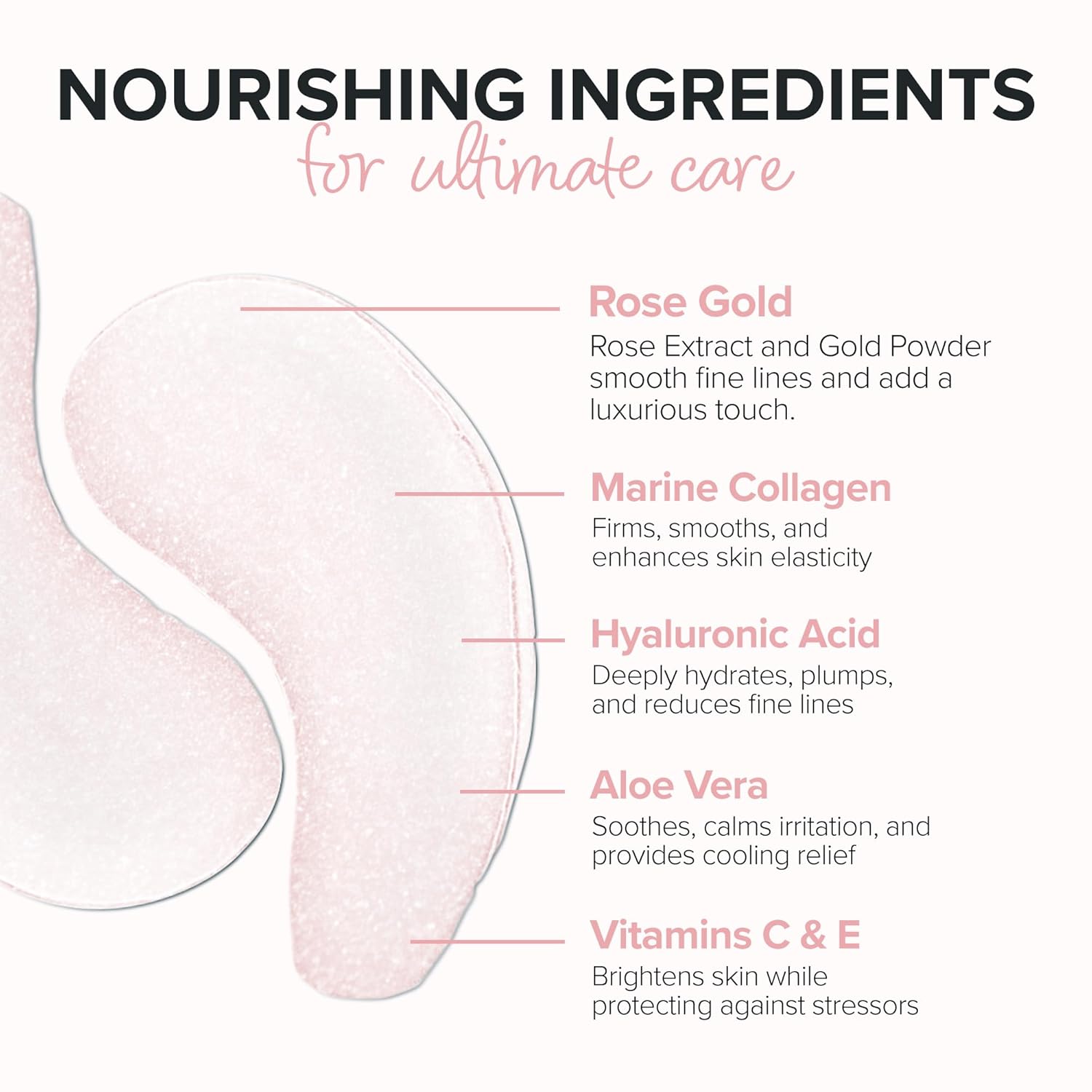 - NUTRIENT PACKED. EYES collagen gel masks are micro-infused with a combination of hyaluronic acid, natural high-density marine collagen, enzymes, amino acids, natural marine minerals, trace elements, proteins and vitamins C & E.