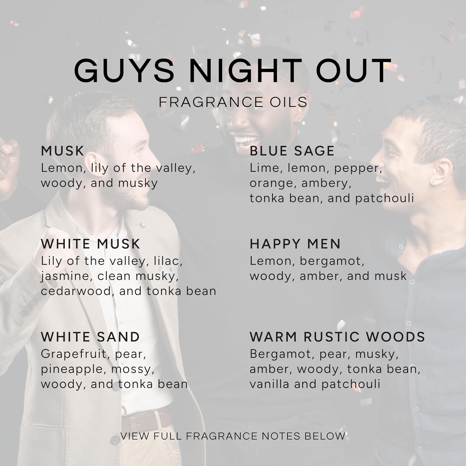 - GUY'S NIGHT OUT SCENTED OILS: Light, refreshing floral and musk smelling scents formulated for making candles, soaps, air freshener sprays, aromatherapy diffusers, dryer sheets and cleaning products. These seasonal essential scents make the perfect gift for the whole family!