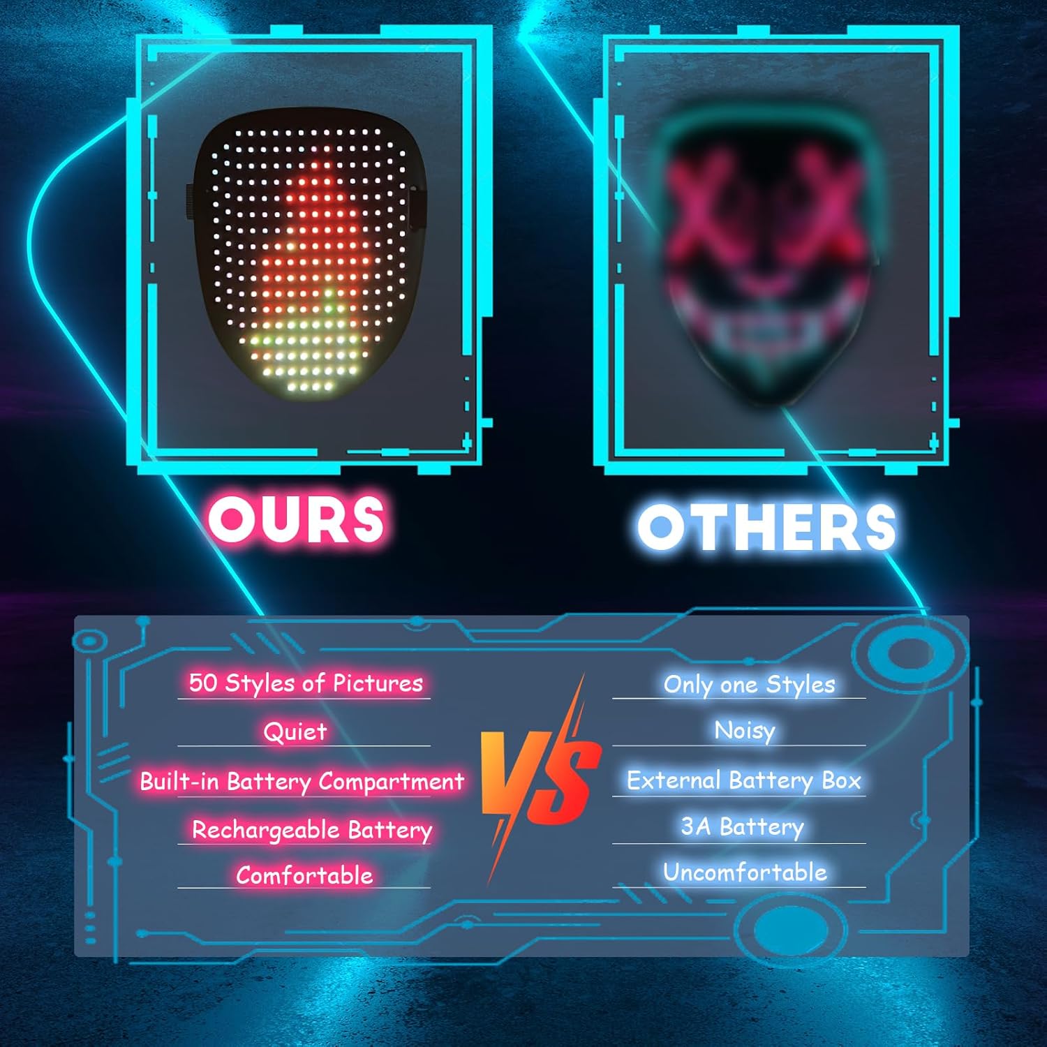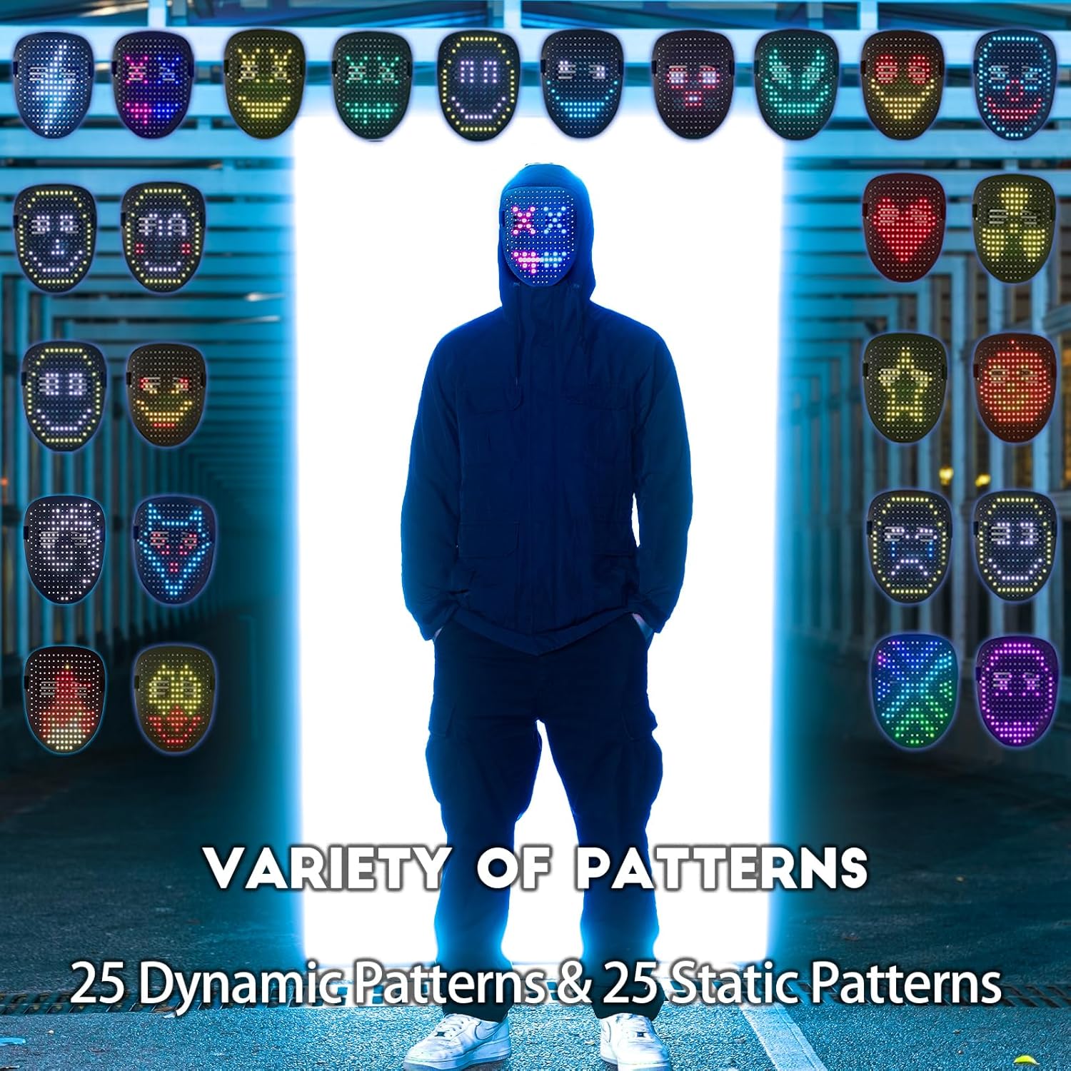 - [50 Patterns Fantastic Display]: Led Mask has 25 dynamic display modes and 25 static display images, led full face mask is Most Amazing Costumes&Cosplay apparel mask, attract everyone's attention.
