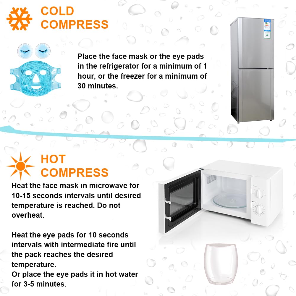 - 【Convenient to Use】Simply store the cooling eye masks in the freezer at -18℃ or lower temperature for at least 2 hours. For better effect,the best freezing time is 2-6 hours.heat the cooling face mask in microwave in 10-15 seconds intervals until desired temperature is achieved,the maximum heating time does not exceed 30 seconds.