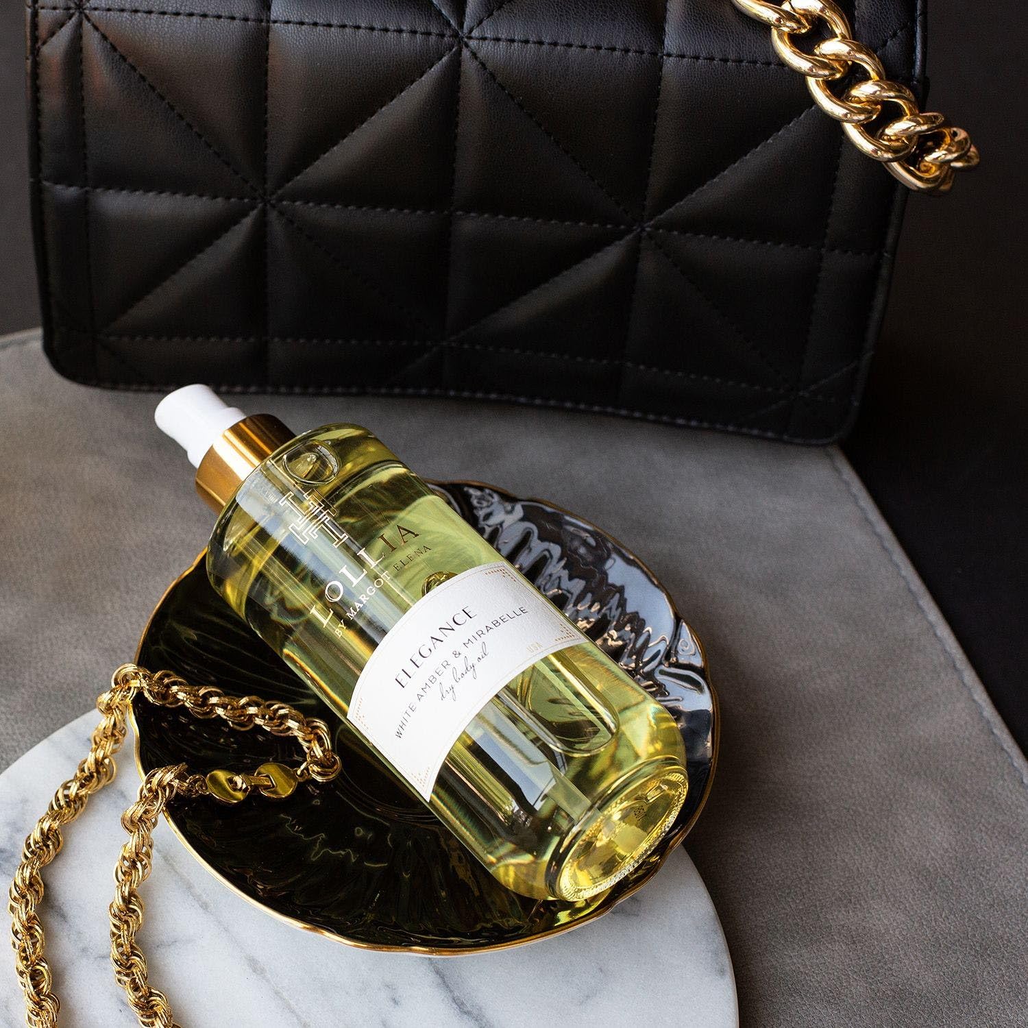 - DRY BODY OIL FOR WOMEN: Lush and gentle, Lollia Elegance Dry Body Oil is a moisture-rich pick-me-up. The body oil spray is delightfully fragranced with White Amber and Mirabelle.