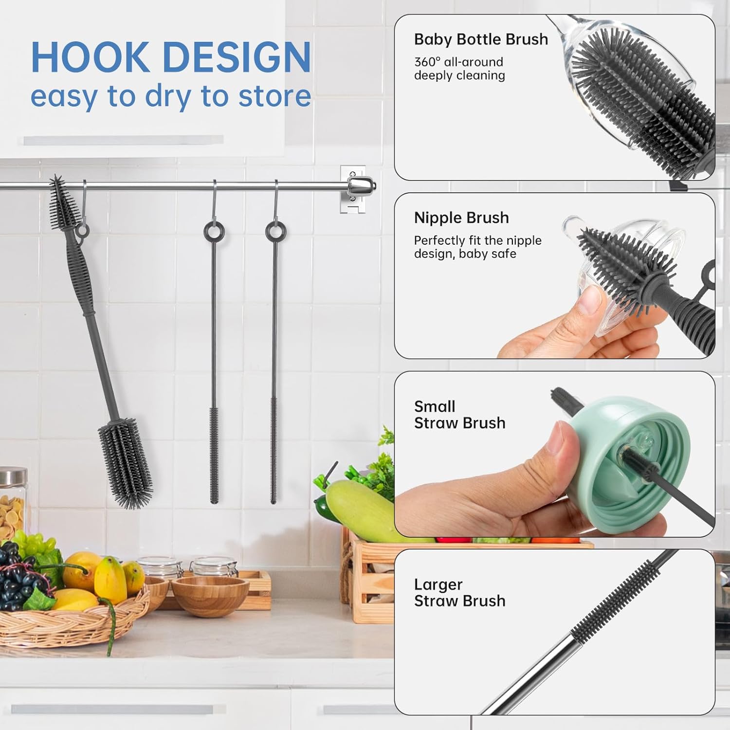 Baby Bottle Brush and Straw Cleaner Brush Set, Extra Long Double-Ended Soft Silicone Brush Cleaner for Baby Bottles, Water Bottles, Cups, Breast Pumps, Detachable & Hangable