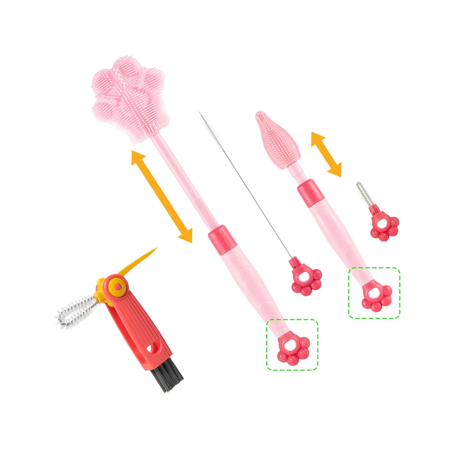 - This product has 3 parts. 1 Pawprint silicone brush and 1 silicone Nipple/Pacifier brush that can adjust the extension length according to needs. Besides, with 1 multifunctional Tiny Cup Lid Gap Cleaning Brushes.