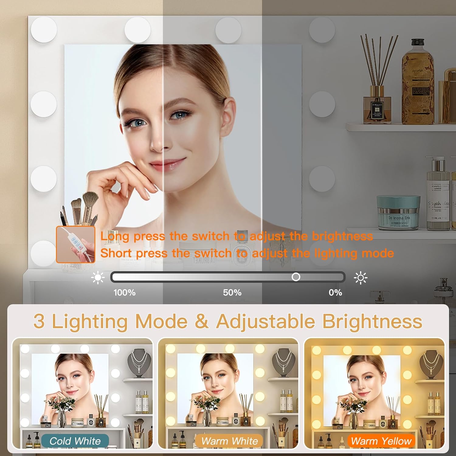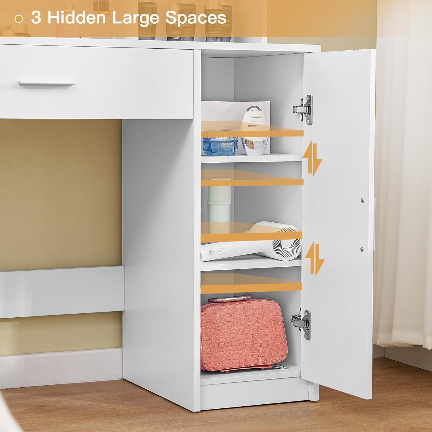 - 【Large Storage】This vanity desk contains 1 oversize drawer, 3 open shelves and 1 large cabinet with 2 height adjustable shelves, provide ample space for all your cosmetics, skin care products, jewelry and other beauty supplies. The dividers in the large cabinet below has three levels of storage to allow you to sorted and stored neatly items.