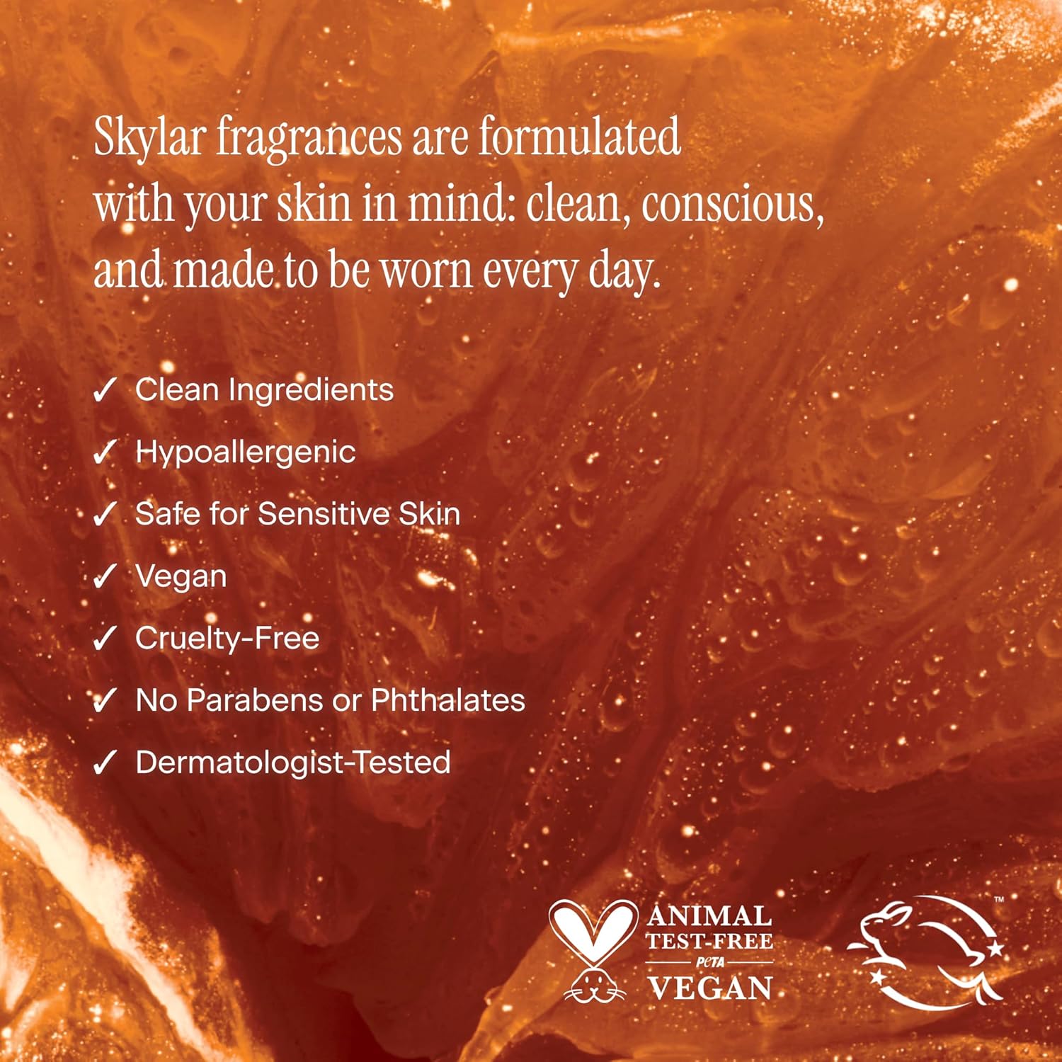 - Clean Fragrance for Women: Skylar's clean beauty perfumes for women are hypoallergenic, vegan, and cruelty-free, ensuring they are safe for sensitive skin. These fragrances are formulated without parabens, phthalates, sulfates, synthetic dyes, or any harmful chemicals, reflecting a commitment to purity and safety.