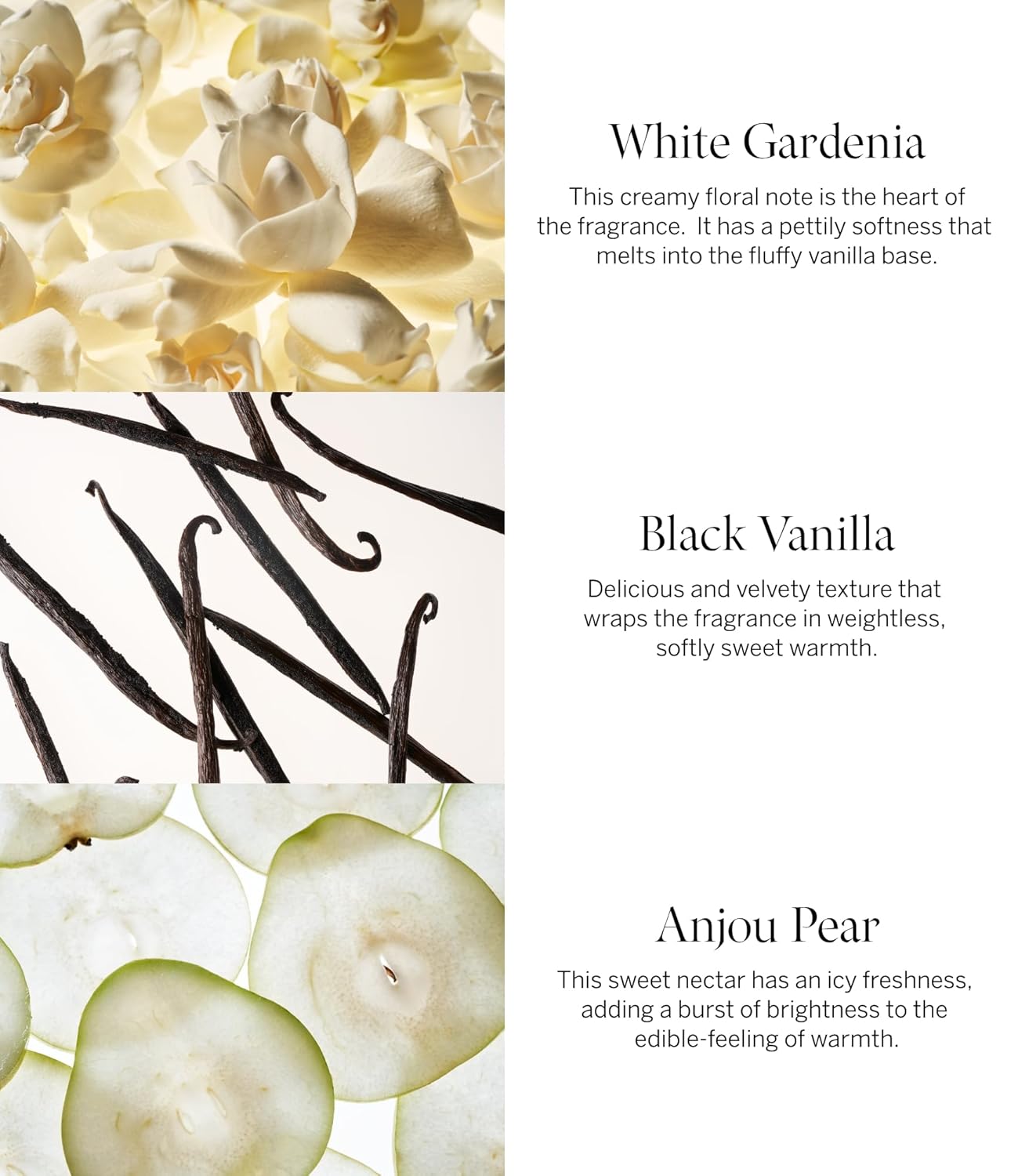 - Notes: white gardenia, Anjou pear, black vanilla