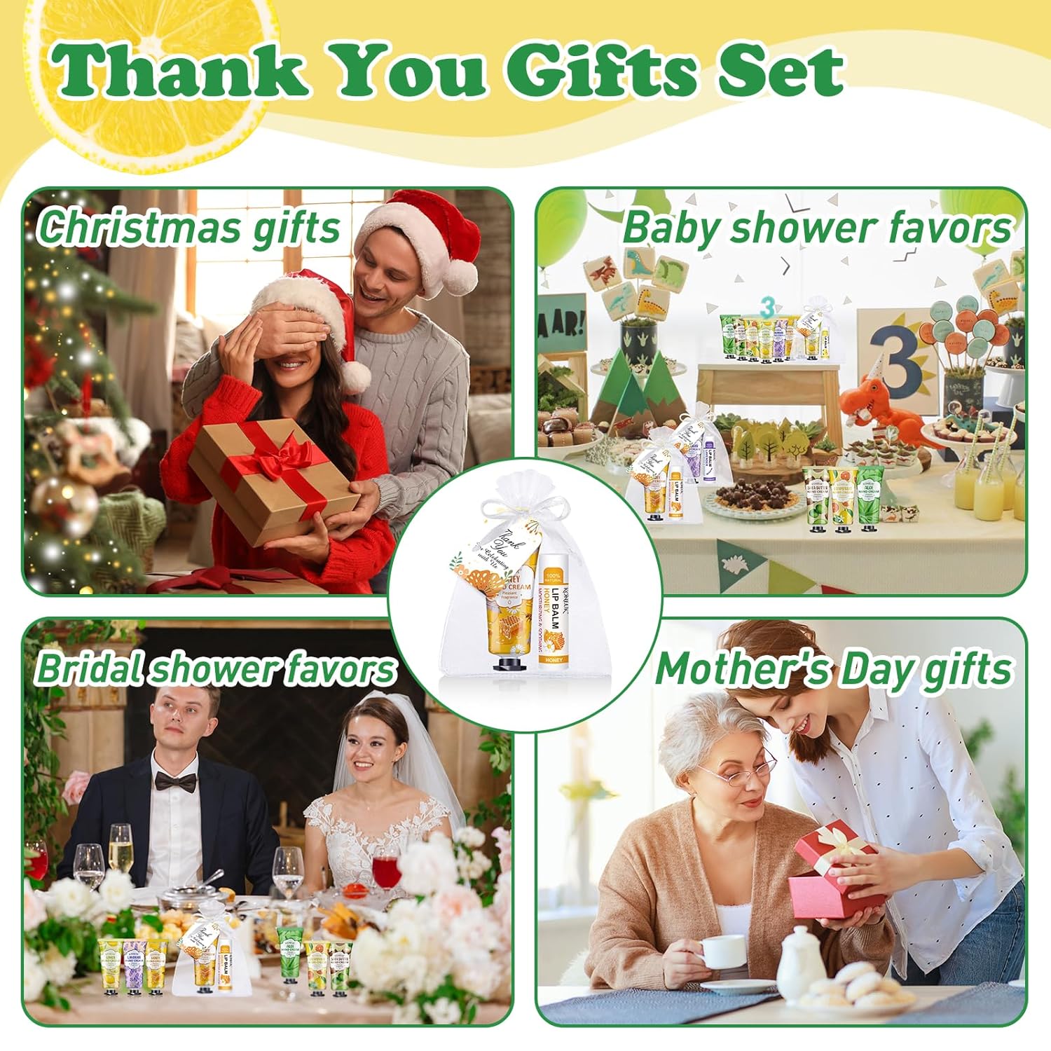 - 【36 Sets Thank You Gifts 】This thank gifts set includes 36pcs hand cream with 6 scents,36pcs lip balms with 6 scents,36pcs organza gift bags,36pcs thank you cards and 1pcs operation instruction.DIY exquisite gift sets and ample quantity,thank you to the guests who celebrate with you