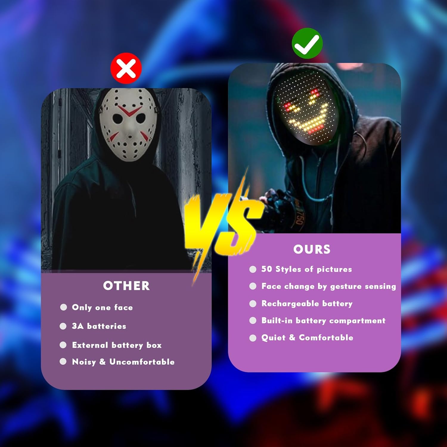 - [50 Pattern Display] The rechargeable mask comes pre-installed with 25 animated patterns and 25 static faces for you to wear. Whether it's a birthday, Halloween, Christmas, rave, or electronic music festival, this light-up mask is suitable for any occasion, to make you the center of attention.
