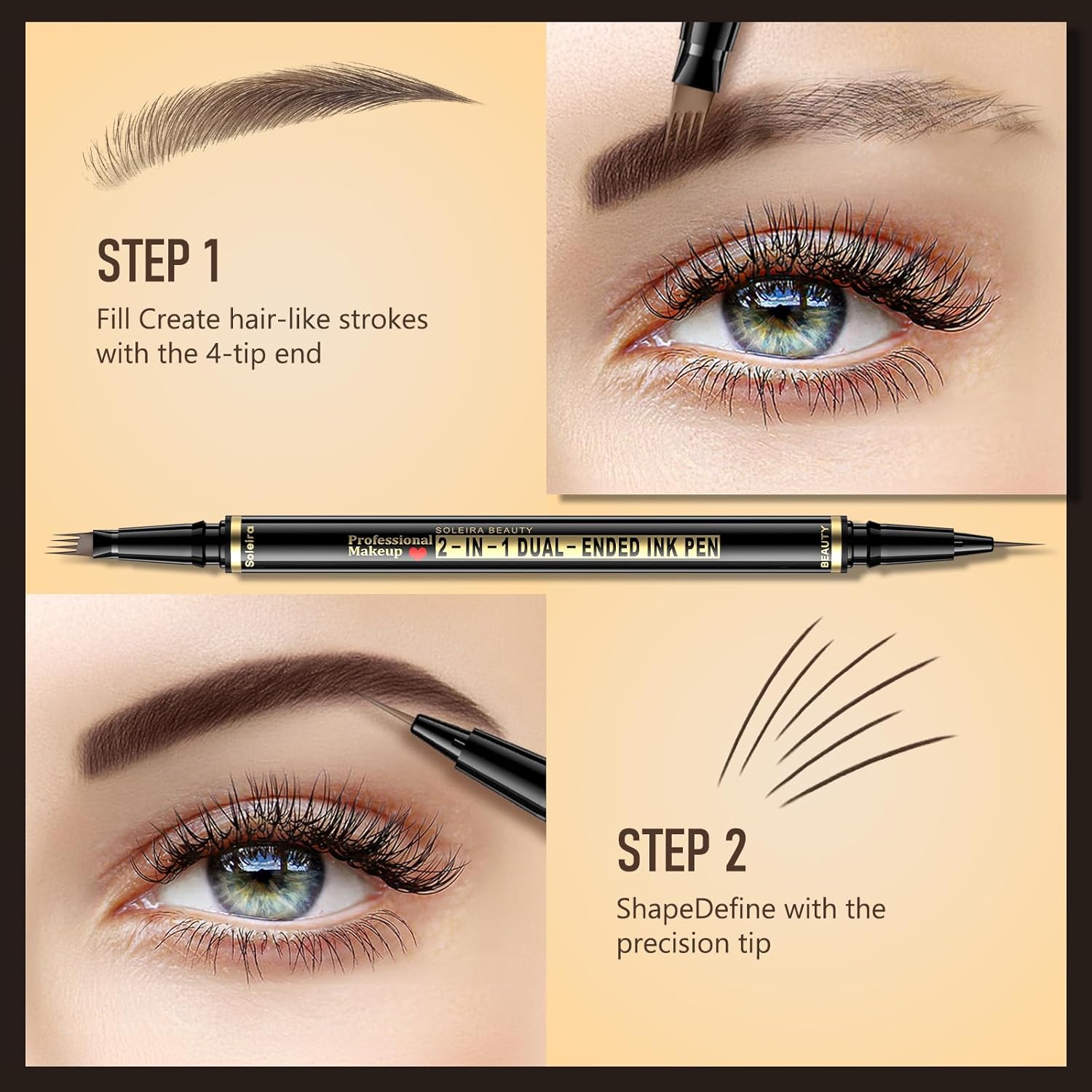 Eyebrow Pen, Soleira Waterproof Eyebrow Pencil with 4 Tip Microblading Eyebrow Pen and Dual-ended Eyebrow Brush, for Natural-Looking Brows, Long-Lasting, Dark Brown