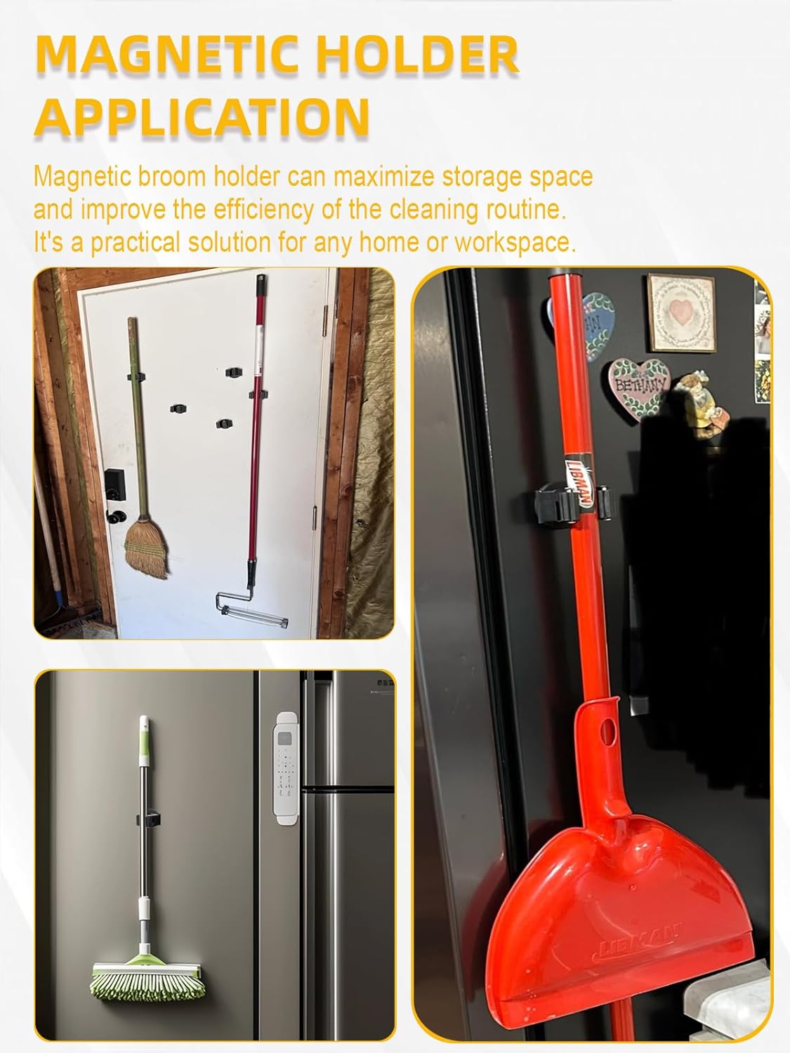- Wide Application: Magnetic broom holder for refrigerator allows you hold various household objects; like broom; mop, dustpan; garden tools; shovels; etc.; can be used in the laundry; kitchen; bathroom; utility room; garage; shed; garden etc