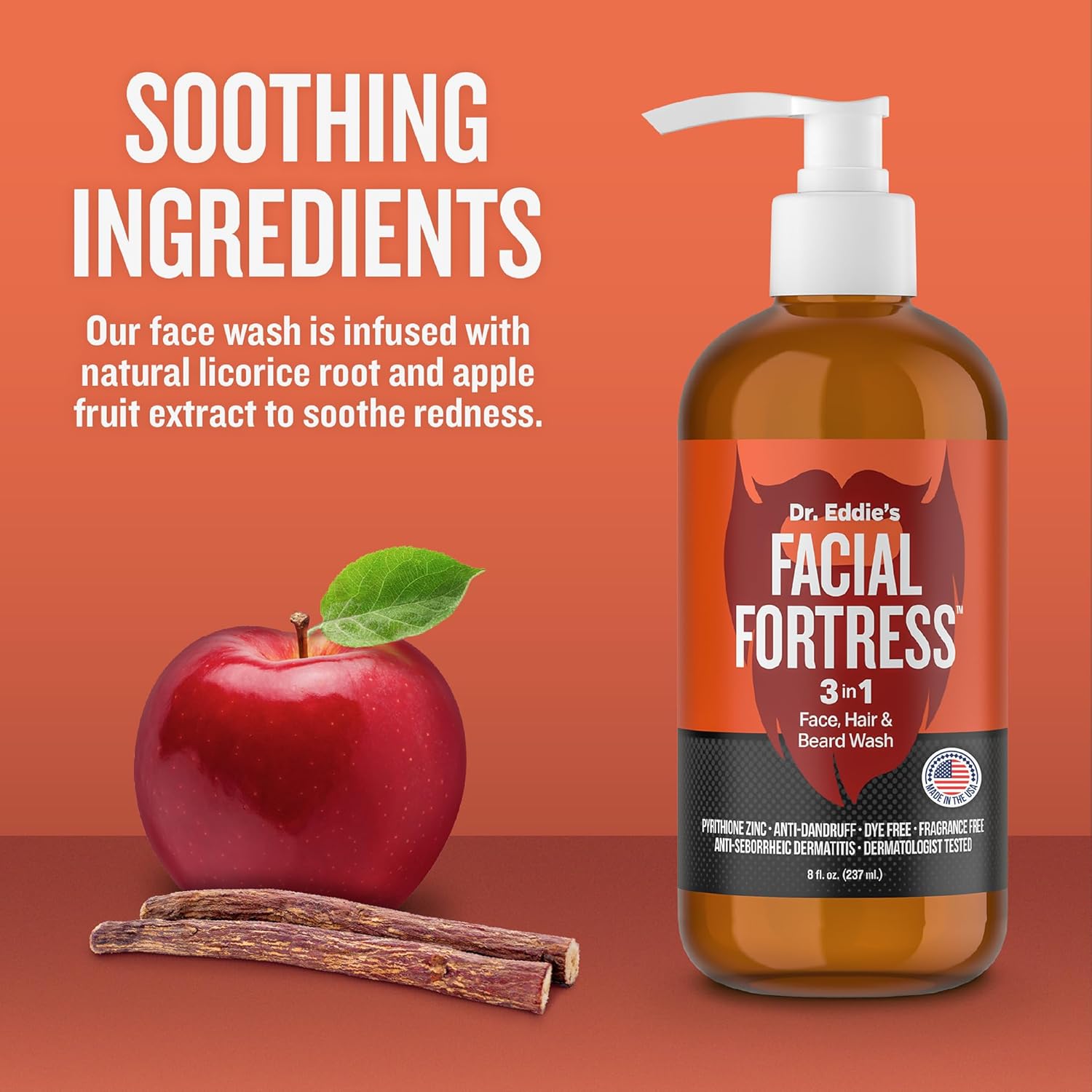 Dr. Eddie's Facial Fortress 3 in 1 Face, Hair, & Beard Wash - Beard Dandruff Shampoo for Men, Beard Cleanser, Face Wash, Beard Care, Face Soap with Pyrithione Zinc - 8 Fl Oz (Pack of 1)