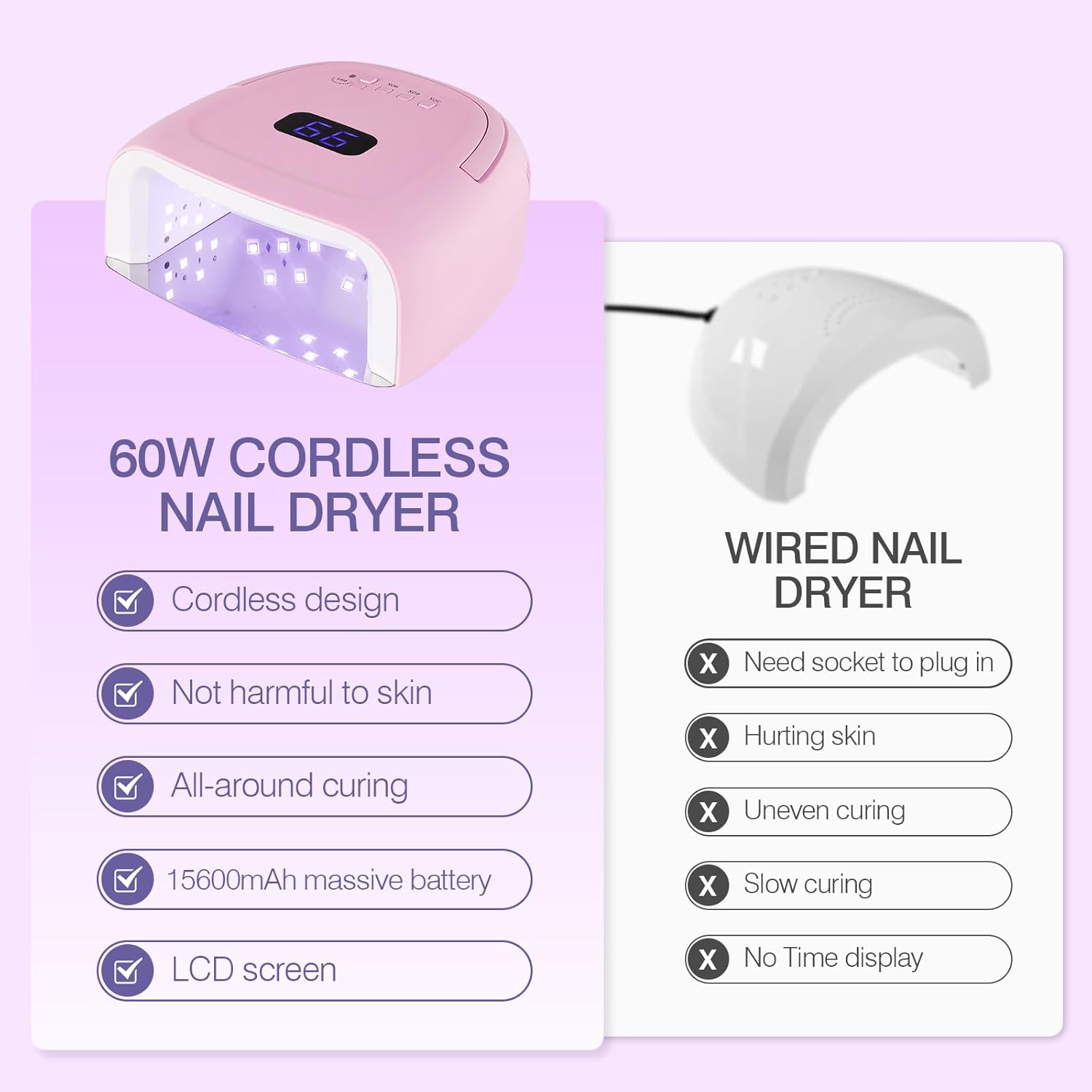 - Multifunctional Pink Cordless Gel Nail Lamp: Choose from four timer modes (30s, 60s, 90s, 99s) to customize curing intensity; Optimized for both quick drying and gentle gel polish activation with temperature control