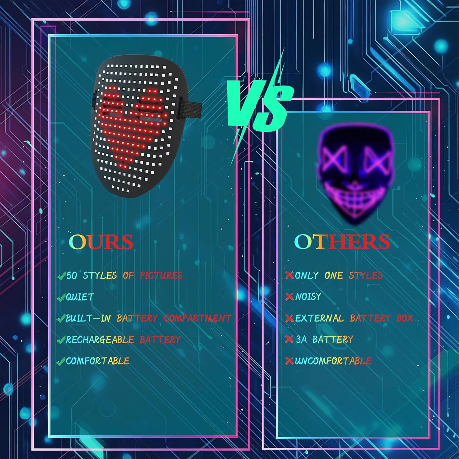 - [Light up Mask with 50 Patterns]: Choose from 25 dynamic display modes and 25 static images. Transform your look instantly with this face transforming LED mask. Its vibrant LED lights and dynamic designs keep your costume fresh and exciting.