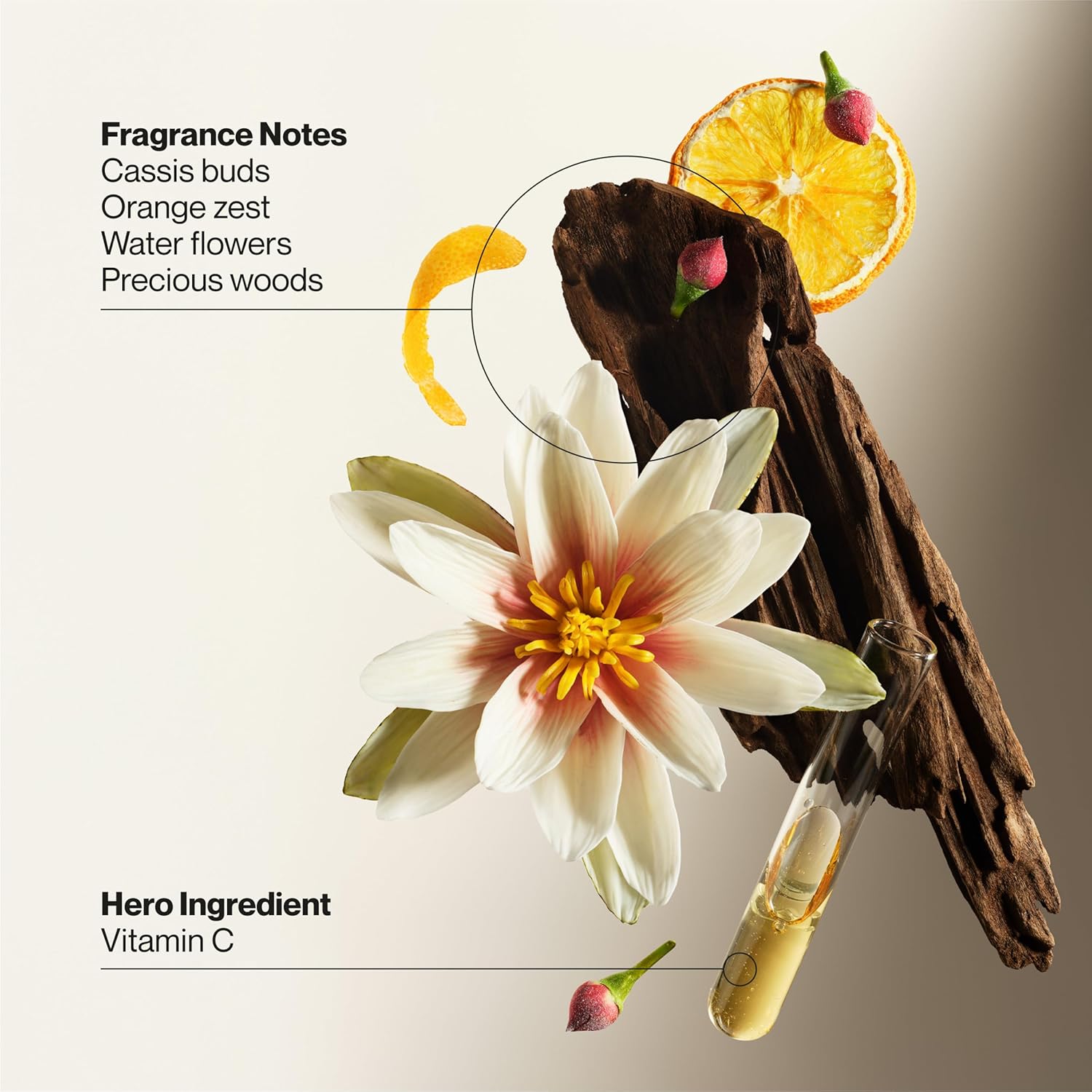 - FRESH SCENT GLOW-BOOSTING LOTION: With fragrance notes of cassis buds, orange zest, water flowers, and precious woods, this daily body lotion with vitamin C helps restore and maintain glowing, radiant skin throughout the day