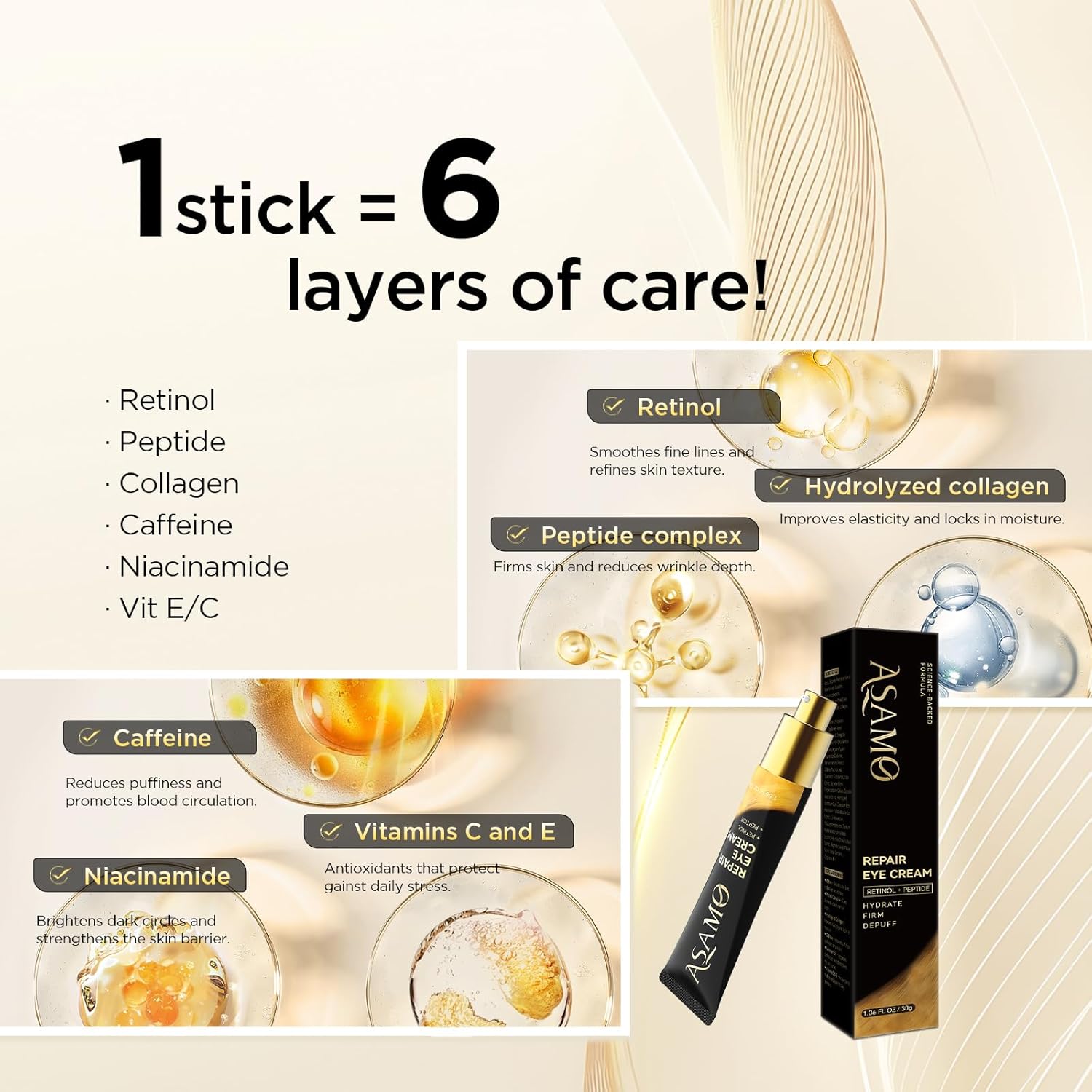 ASAMO Retinol Eye Cream – Retinol and Peptides for Fine Lines, Puffiness, and Under-Eye Shadows, Anti Aging, Eye Care Daily Wrinkle Cream,1.06 fl.oz
