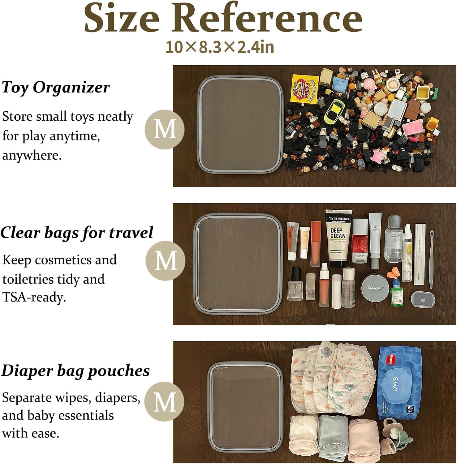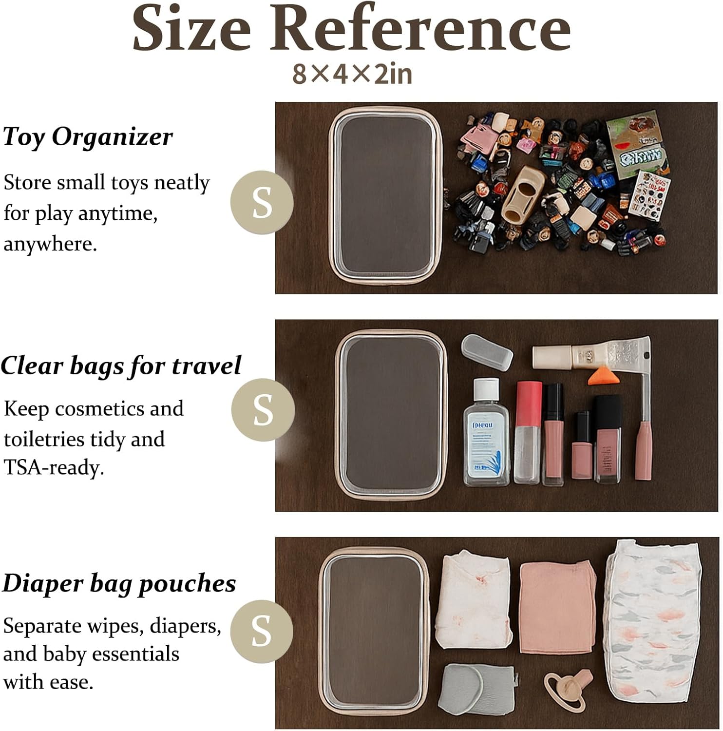 - Multi-Use Storage for Daily Essentials. Perfect as a bag organizer for makeup, toiletries, charging cables, pens, or travel-size items. Whether at home or packing a diaper bag, these clear zipper pouches help sort small items with ease.